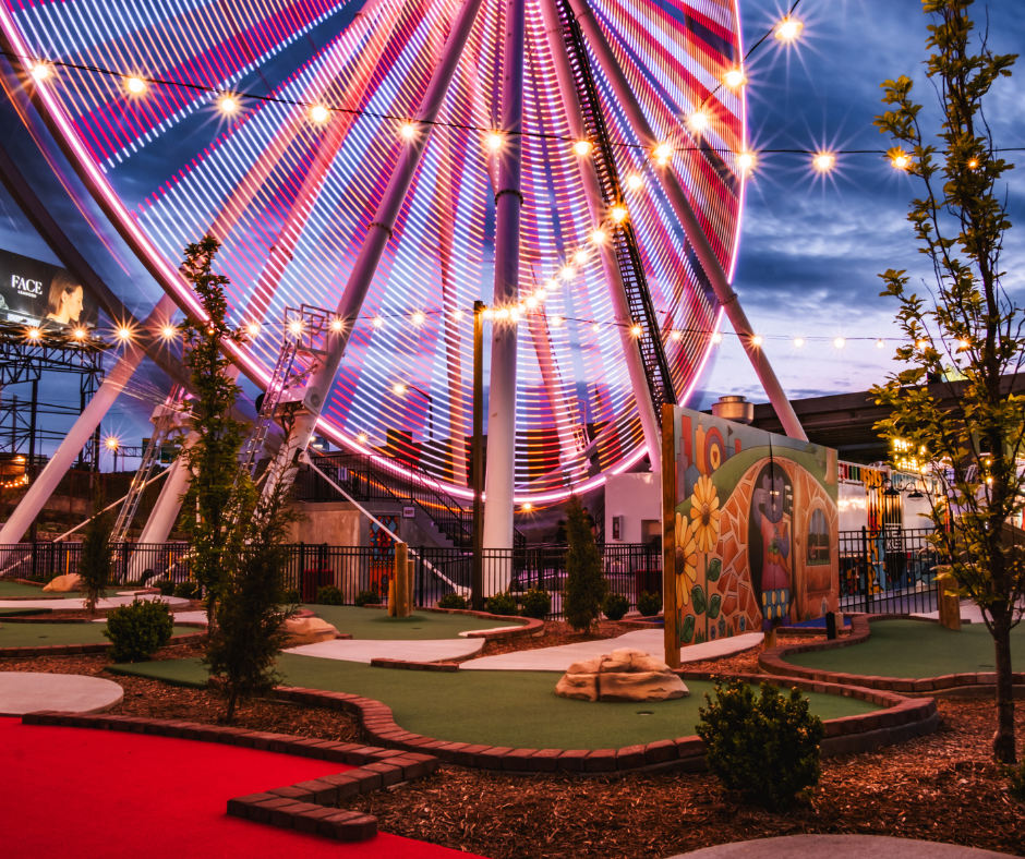 At the base of the wheel is Pennway Putt, a KC-themed 16-hole mini golf course where you can challenge friends and family to a little competition following your ride on the wheel!