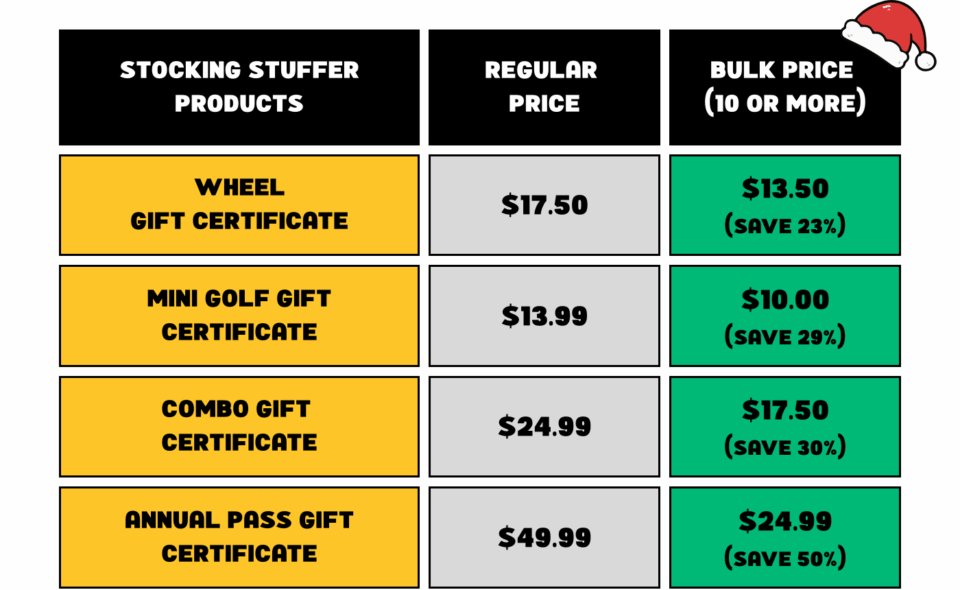 ● All ticketed product gift certificates (Wheel, Mini Golf, and Combo Tickets) are good until the end of 2026!